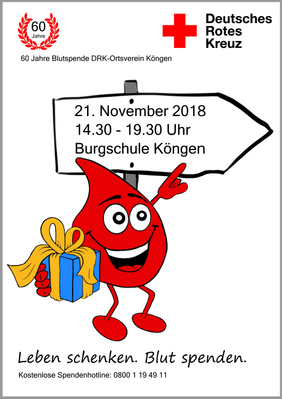 Am 21.11.2018 rief der Blutspendedienst des Deutschen Roten Kreuzes gemeinsam mit uns vom DRK-Ortsverein wieder alle Bürgerinnen und Bürger zur Blutspende auf. Das Besondere an diesem Tag war: Wir konnten ein kleines (großes) Jubiläum begehen – seit 60 Jahren, genau seit dem 11.11.1958, wird in Köngen Blut gespendet. Dafür von unserer Seite ein großes Dankeschön an Sie alle!